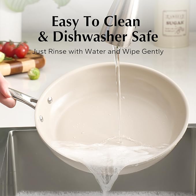 - COOL & STURDY HANDLE: Crafted from lightweight, precision-pressed stainless steel, this ergonomically designed handle ensures a comfortable grip. Double-riveted for exceptional strength and maneuverability, ceramic saute pan empowers you to seamlessly transition from stovetop to oven, allowing you to achieve that flawless sear, brown toppings, or even bake