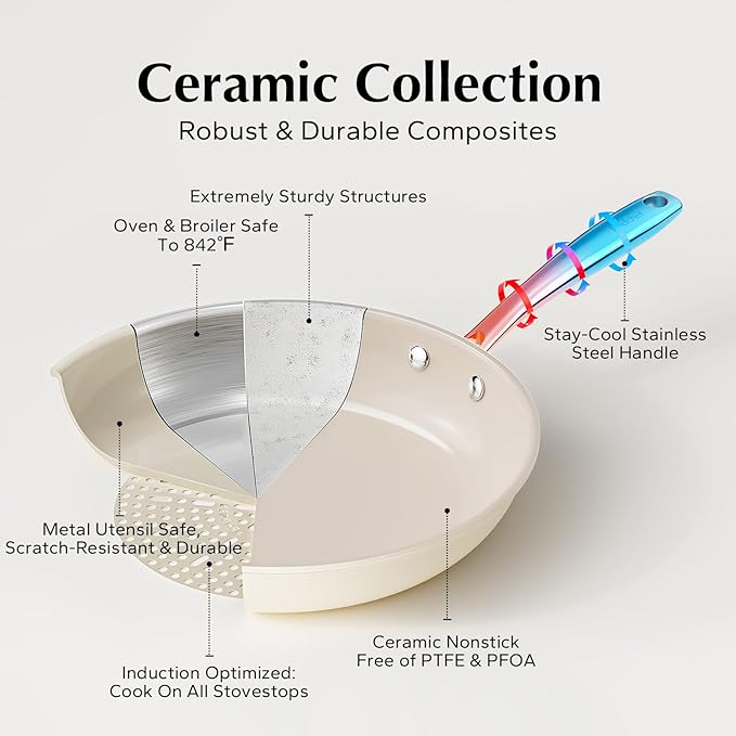 - EXCELLENT COMPATIBILITY: Versatility at its finest, our kitchen cookware, the ceramic nonstick frying pan is designed to thrive in any kitchen and on any cooktop. Whether you're cooking on induction, gas, or electric stovetops, this ceramic skillet performs with excellence. Plus, it's oven-safe, with both the handle and nonstick coating able to withstand temperatures of up to 842 °F, surpassing the capabilities of traditional cookware