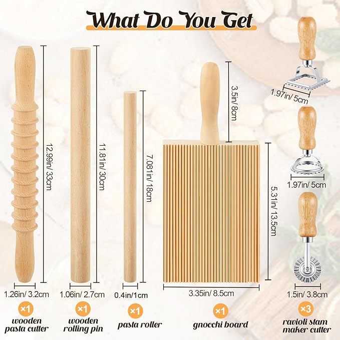 - Comprehensive Pasta Making Set: this package includes a wooden pasta cutter, a ravioli rolling pin, a gnocchi board, a pasta roller, and 3 pieces of ravioli stamp maker cutter, each differently, including round, square, and rollers; These tools combine to create a set that meets your pasta making needs