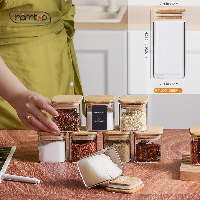12Pcs 9oz Spice Jars Glass Container with 275 Labels, Airtight Seasoning Empty Organizer with Bamboo Lid Set for Food Storage, Salt, Sugar