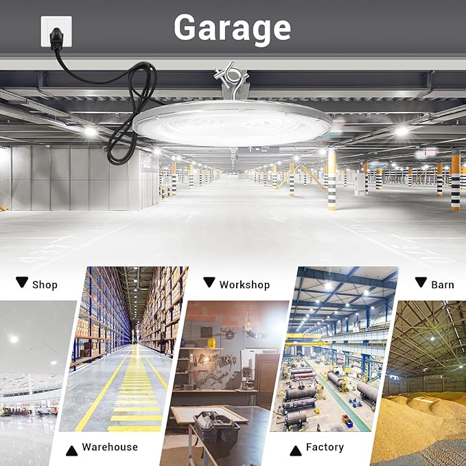 - 【Easy & Quick Installation】This UFO Led High Bay Light can be easily installed in seconds with the 5FT power cord provided and the built-in hook. It comes with US plug with which you can plug to the power directly, safe and secure for extremely easy installation.Ideal indoor lighting,This LED highbay light can work under power supply of AC120V