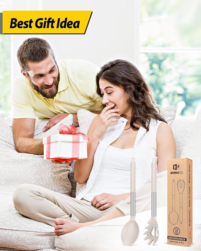 Silicone Pasta Fork and Cooking Spoon Set, Non Stick Kitchen Utensils for Cooking,Stirring,Serving Spaghetti, Soup, Sauce (KHAKI)