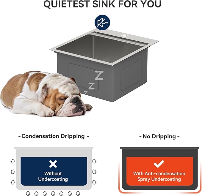 - Quiet Use + Fast Drainage. We hate loud sinks that echo and condensation that ruins cabinets, so we added an anti-condensation coating on the bottom (prevents water droplets from dripping into cabinets, water damage) and thick rubber padding (washes feel whisper-quiet—great for late-night snack prep). The 3.5-inch drain fits almost all garbage disposals and kitchen gadgets, and the slightly tilted bottom drains water fast—no standing puddles to wipe up later.