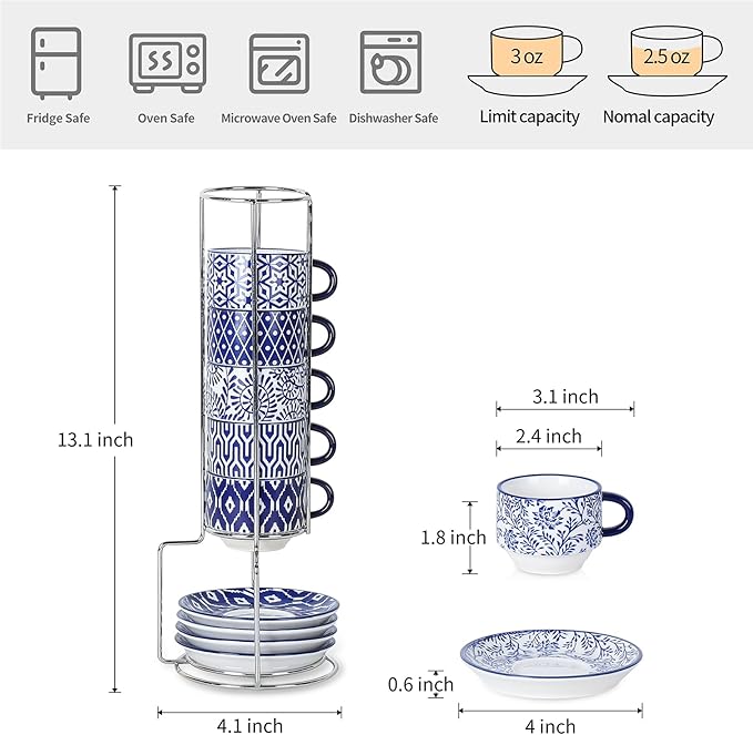 - GREAT ESPRESSO CUP SET COMBINATION, SPACE SAVING - These stackable espresso cups are compact to take up little space and come with a sturdy metal stand that can avoid being randomly placed. The matching saucers provide a place to rest your spoon and make you enjoy the mood of traditional Italian Coffee in an elegant way.