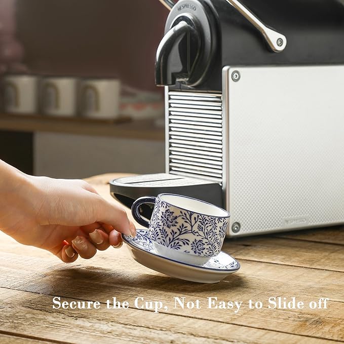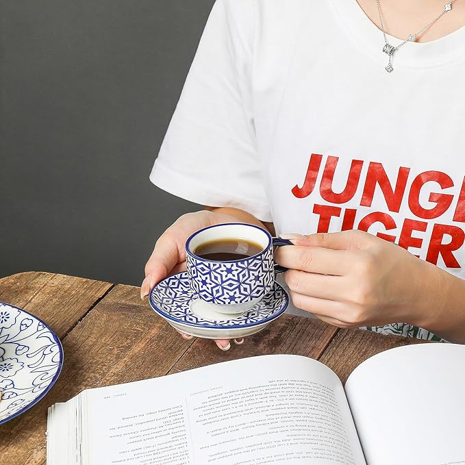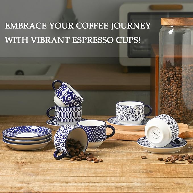 - DELICATE DESIGN - Each demitasse cup with its matching saucer has unique patterns and bright colors, which look outstanding to display near your espresso machine! Using these delicate cups makes you cheerful and feels like you are in a cafe.