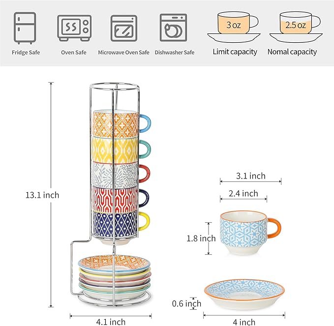 - GREAT ESPRESSO CUP SET COMBINATION, SPACE SAVING - These stackable espresso cups are compact to take up little space and come with a sturdy metal stand that can avoid being randomly placed. The matching saucers provide a place to rest your spoon and make you enjoy the mood of traditional Italian Coffee in an elegant way.