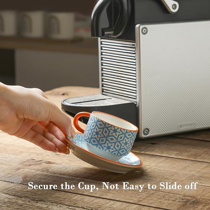 - DELICATE DESIGN - Each demitasse cup with its matching saucer has unique patterns and bright colors, which look outstanding to display near your espresso machine! Using these delicate cups makes you cheerful and feels like you are in a cafe.