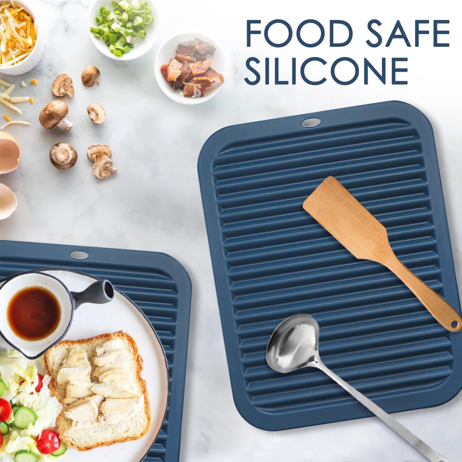 - VERSATILE & MULTIPURPOSE MATS: Use the large heat resistant silicone mats as a hot pad, countertop protector, pot holder, jar opener, spoon rest, dish drying mat, teapot mat or anywhere you need extra grip. The square blue trivet is also perfect for use in an oven, microwave, air fryer, or freezer, protecting kitchen table from hot and cold damage.