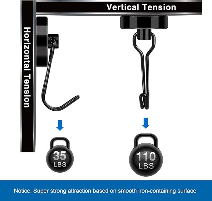 - 【 High Quality 】 The rotating swing magnetic hook heavy duty has a pulling force of 110 pounds and is based on horizontal applications - reducing by 2/3 if used vertically. The magnetic hook features a heavy and stable magnetic surface, with strong magnetism lasting forever!