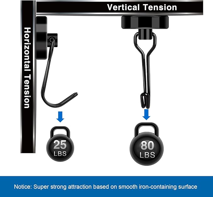 - 【 High Quality 】 The rotating swing magnetic hook heavy duty has a pulling force of 80 pounds and is based on horizontal applications - reducing by 2/3 if used vertically. The magnetic hook features a heavy and stable magnetic surface, with strong magnetism lasting forever!