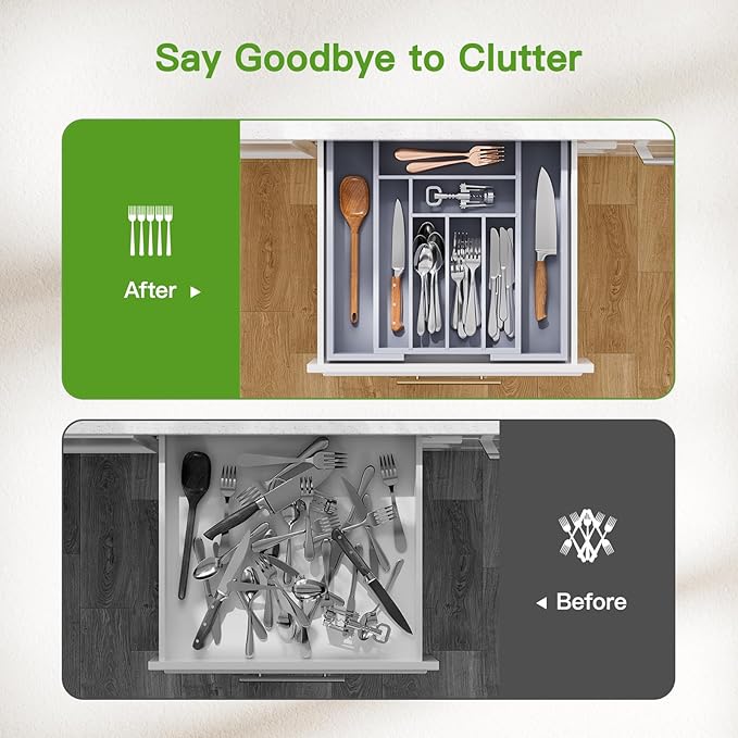- Expandable and Adjustable Utensil Organizer: Designed with 6-8 compartments, the silverware organizer can save space while accommodating multiple items, which is expandable from 10.31 inches to 16.54 inches wide with smooth sliding.