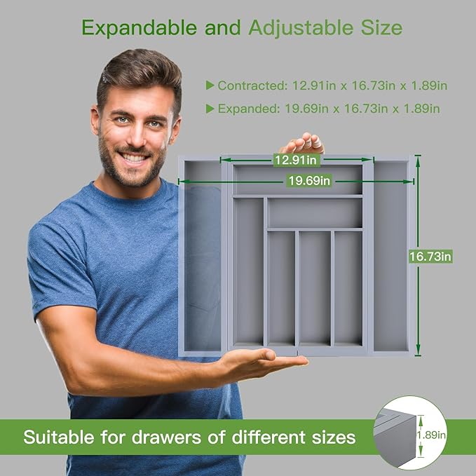 - Expandable and Adjustable Utensil Organizer: Designed with 6-8 compartments, the silverware organizer can save space while accommodating multiple items, which is expandable from 12.91 inches to 19.69 inches wide with smooth sliding.