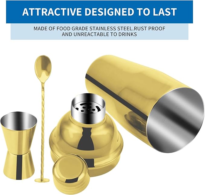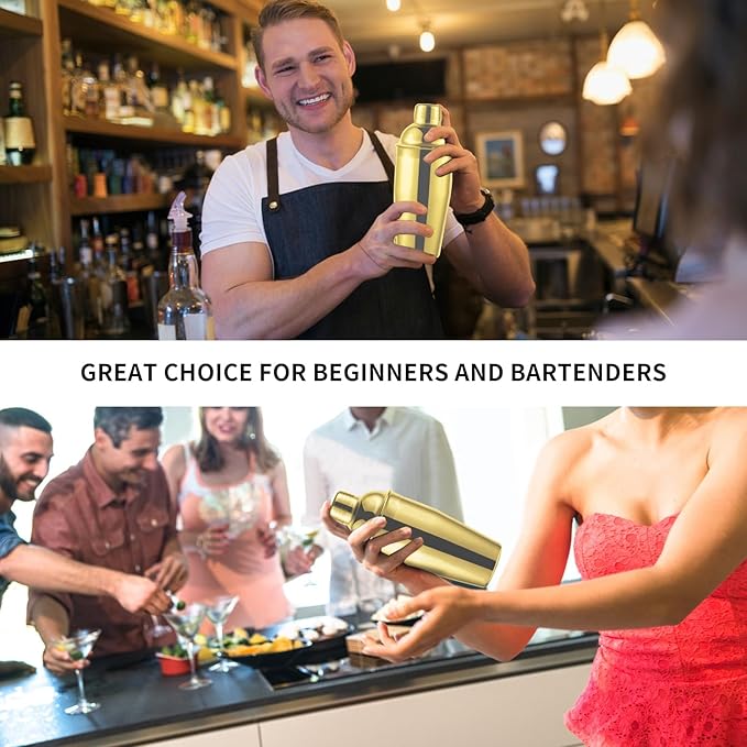 24oz Cocktail Shaker Bar Set, Martini Shaker with Built-in Strainer, Measuring Jigger, Mixing Spoon, Professional Stainless Steel Large Bartender Drink Shaker Margarita Alcohol Mixer-Gold
