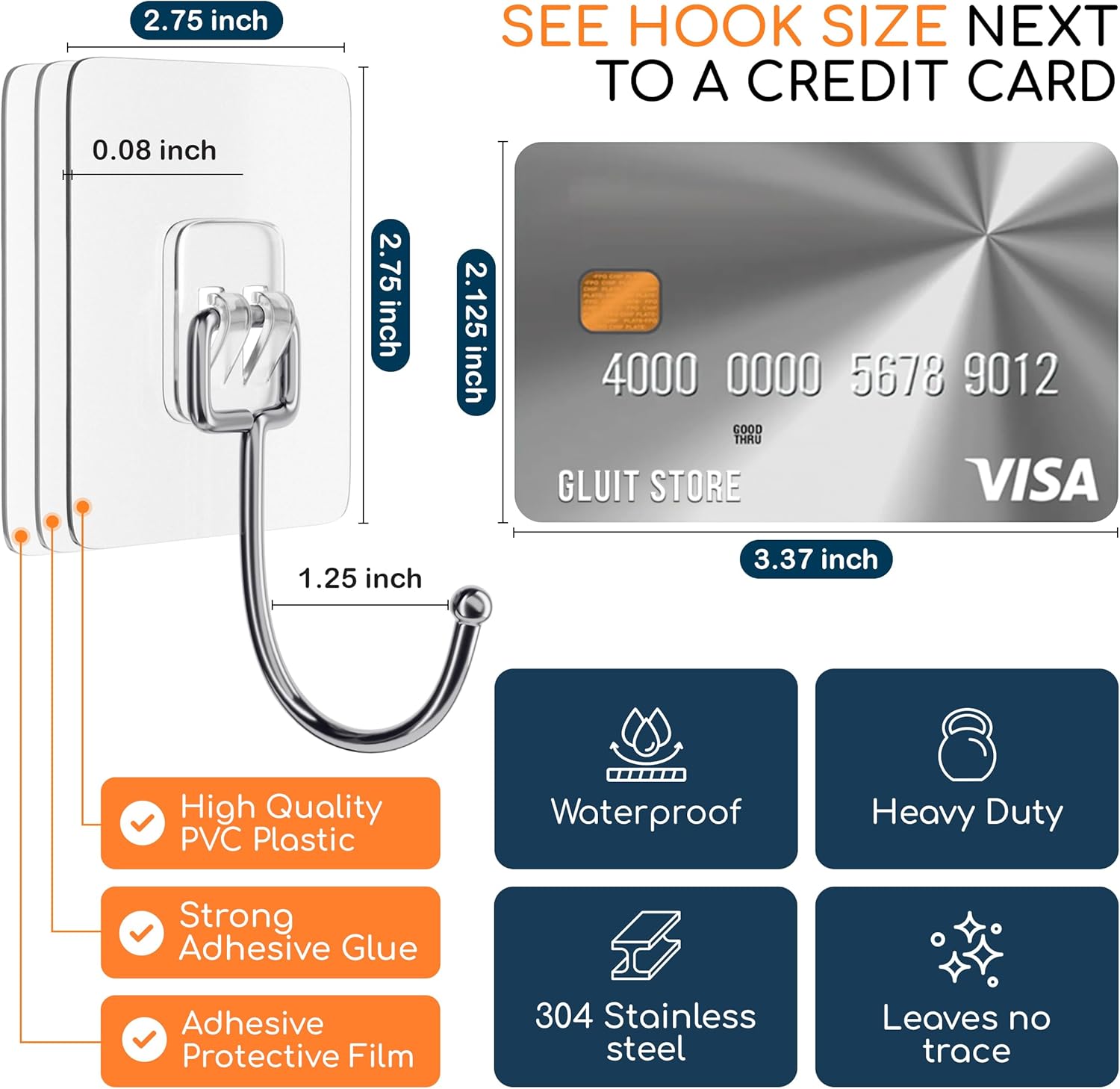 - Premium materials: Adhesive hooks crafted from robust stainless steel and durable PVC; high quality and longevity; remain clean and unaffected by time; non-toxic, recyclable, and transparent.