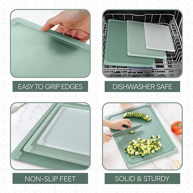 - DISHWASHER SAFE & EASY TO CLEAN:Our plastic kitchen chopping boards are BPA free and can be hand washed to remove stains after use, or washed in the dishwasher.