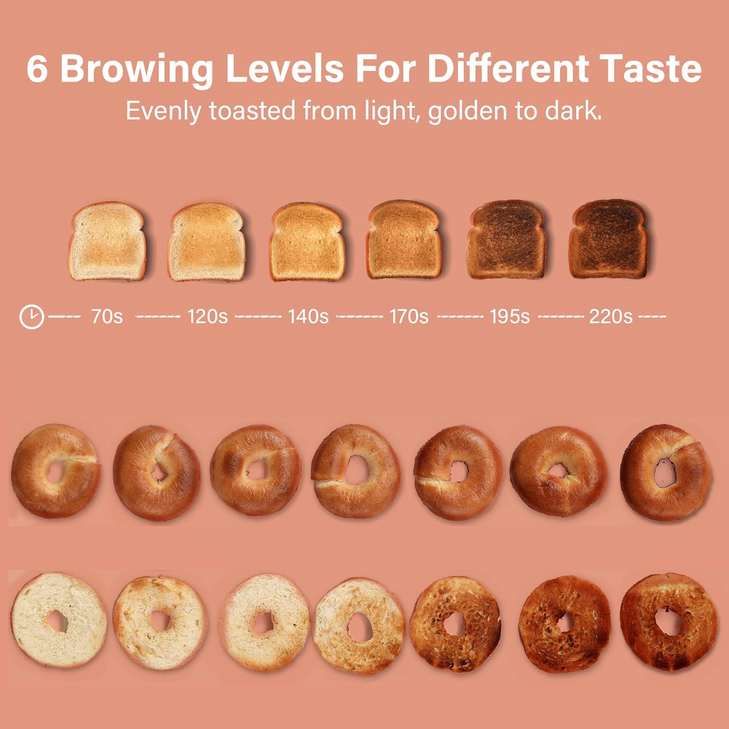 - 6 Setting Shadow Knob: Roter Mond toaster has 6 different baking settings for you to choose with lower settings and higher settings from 70 seconds to 220 seconds, adjustable for everyone's taste, with time and shadow being controllable. You can complete the perfect toast and enjoy your desired tastes