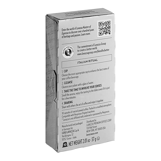 Lavazza Espresso Ristretto Dark Roast Arabica & Robusta Aluminum Capsules Compatible with Nespresso Original Machine, 10 Count, Intense and full bodied, dark crema, Intensity 12 of 13