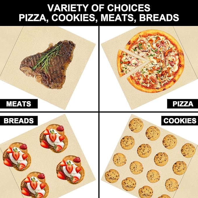 - Package contains two pizza stones (one T-shaped and one square). Square pizza stone measures: 16.7'' x 16.7''; T-shaped pizza stone measures: 16.7'' x 7.9''; Material: All natural Cordierite. Solid piece that cooks evenly. Can be used in home kitchens, family gatherings and parties. Can be used to bake bread, pizza, pies, cookies, and pastries, etc.