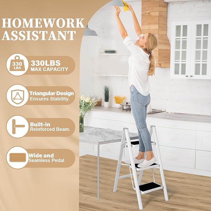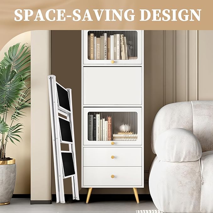 - 【SPACE SAVING】Save space with our 3-step ladder, folding down to a mere 2.3'' width, making it easy to store in tight corners, against walls, or under beds and cabinets.