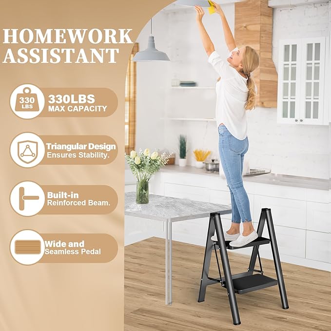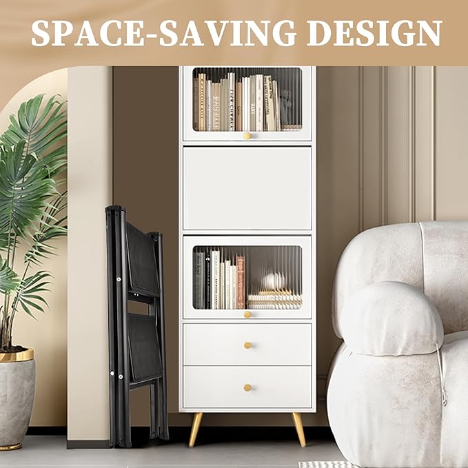 - 【SPACE SAVING】Save space with our 2-step ladder, folding down to a mere 2.3’’ width, making it easy to store in tight corners, against walls, or under beds and cabinets.