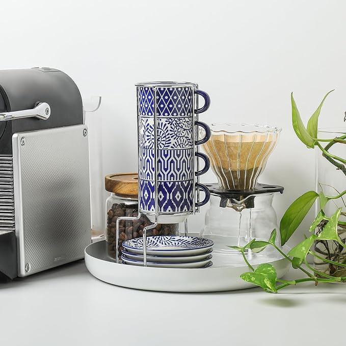 Selamica Ceramic Espresso Cups with Saucers and Metal Stand, 4 OZ Stackable Cappuccino Cups, Demitasse Cups for Latte Coffee Café Mocha Tea, Set of 4, Vintage Blue