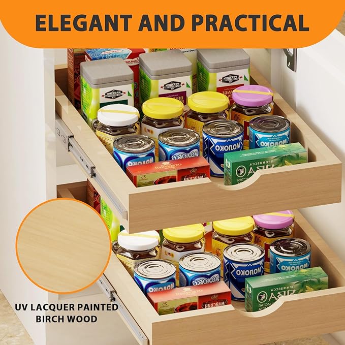 - š²[Sturdy Solid Wood & Soft-Cushioned Sliders]: The pull out drawers is made of natural solid poplar and birch wood, safe to protect you and your family's health. It can withstand up to 57 pounds and is durable. The slider features cushioning and anti-collision technology, ensuring a gentle grip and silent closing, creating a tranquil home environment