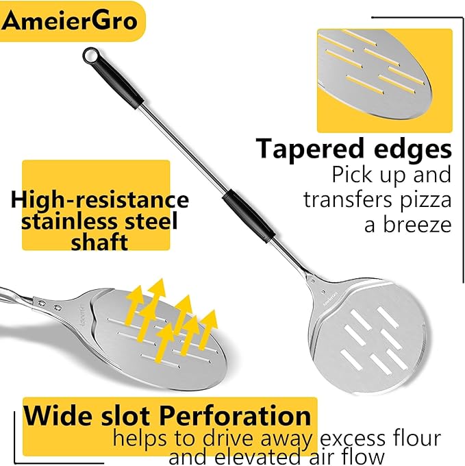 - AmeierGro 9-inch pizza turning peel, Crafted with precision, this turner peel blade is made of high-quality aluminum oxide, ensuring durability and longevity. Confidently slide your pizzas into your pizza oven, the perfect crust will be achieved.
