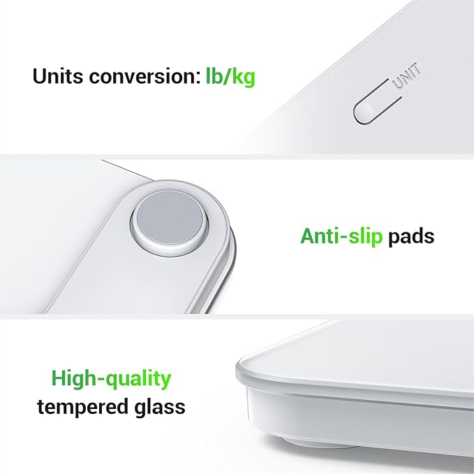 - Easy & Convenient: Our bath scale features an easy-to-read display with automatic on/off, low battery, and overload indicators. Choose between lb/kg units for effortless weighing convenience