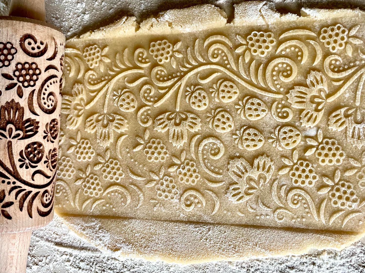- COMFORTABLE DESIGN - This rolling pin with pattern is made with ergonomics in mind so that anyone can use its mesmerising designs! Rolling pin measures are approximately 9.5" (24 cm) from handle to handle, embossing part 4,5 inches (11 cm), diameter 2" (5 cm), made of beech wood. The finished product is food safe.