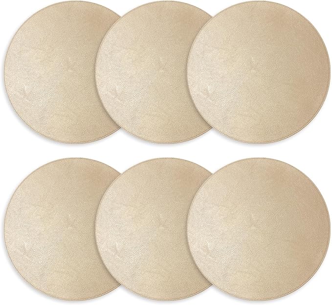 Placemats Set of 6 – Round 15” Faux Leather Table Mats for Dining, Heat Resistant & Non-Slip Washable Table, Indoor, Outdoor, Dining Table Set for 6, Modern Kitchen & Holiday Use, Champagne