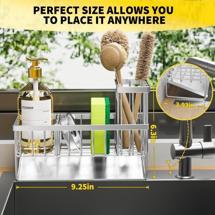 - ăSMALL VOLUMEă Cisily sponge holder is suitable for kitchens with limited space. It measures only 9.25"*3.97"*6.37", Holds a detergent bottle, a sponge ball and sink stopper. With an extra upgraded brush holder that can hold up to 4 small and large sized brushes, with the Cisily Sink caddy you can save countertop space perfectly.