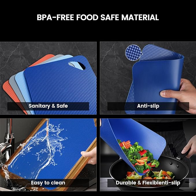 - [Get Efficiency and Protection with Cutting Board Mat] Our colorful plastic cutting board mats, constructed from food-safe grade PP material, offers flexibility and a non-slip surface. The high-density plastic material is dishwasher-safe, ensuring effortless cleanup. Furthermore, it can be easily rolled up, providing reliable stability when transferring food. The non-slip cutting board mat on the front of the butcher block fits securely, preventing sliding and knife scratches