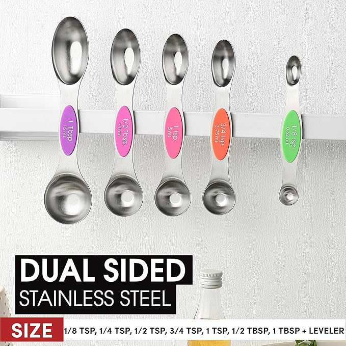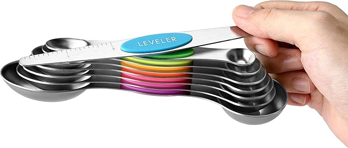 - Magnetic For Easy Use And Storage - These magnetic spoons let you use one spoon at a time and then they nest together for easy storage. Quickly grab the spoon you need without having to fumble with opening and closing a ring. They even have U.S. and metric measurement markings that are easy to read and won't fade or rub off.