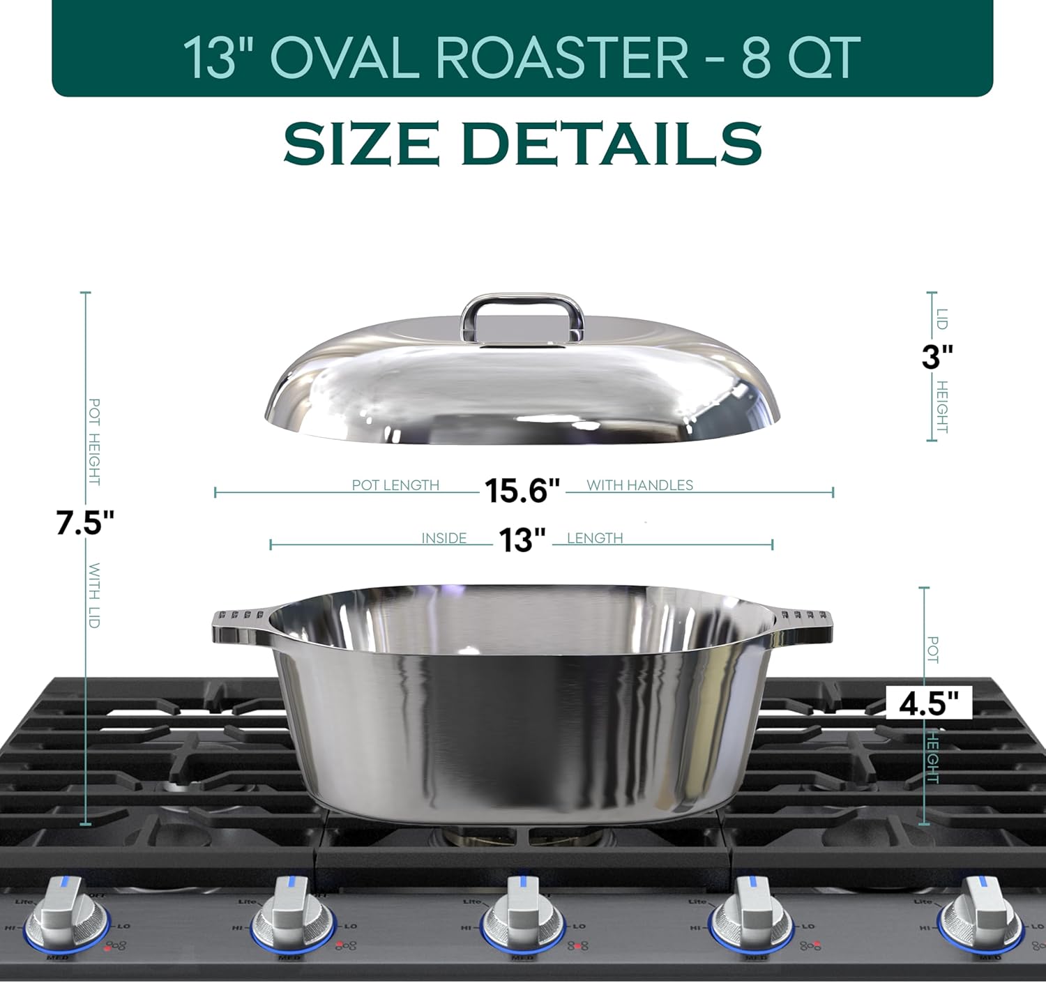 Cast Aluminum Oval Dutch Oven with Lid — 8 QT Heavy Duty Roaster Pan with Rack & Silicone Cover Dual Handles — Cajun Cookware for Roasting, Baking, Cooking (13" Medium)