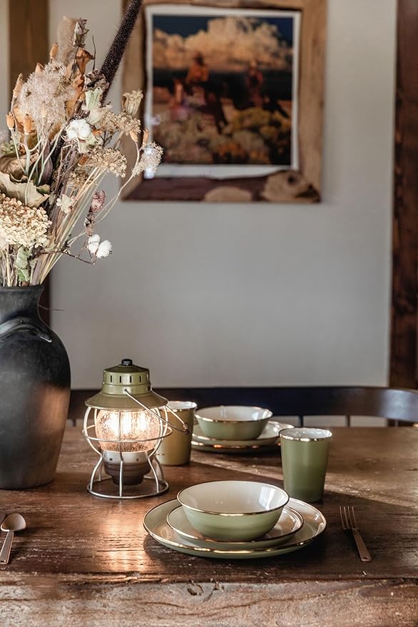 - Classic and Stylish: The new 2-tone enamelware features a smooth and speckled, enameled white interior that guards against food stains, paired with a textured matte olive drab exterior, providing superior grip and resilience. The signature bronze-like stainless steel rim adds a sophisticated touch