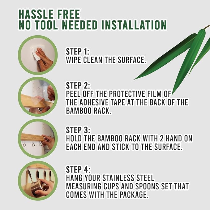 - PACKAGE INCLUSION: This is a complete package of 2 premium bamboo hanging racks with the 9-pc set of high quality stainless steel measuring cups and spoons. Hanging rack and measuring set are for the most commonly measurement used for baking or cooking, i.e. 1 cup, 1/2 cup, 1/3 cup, 1/4 cup, 1 tablespoon, 1/2 tablespoon, 1 teaspoon, 1/2 teaspoon and 1/4 teaspoon.