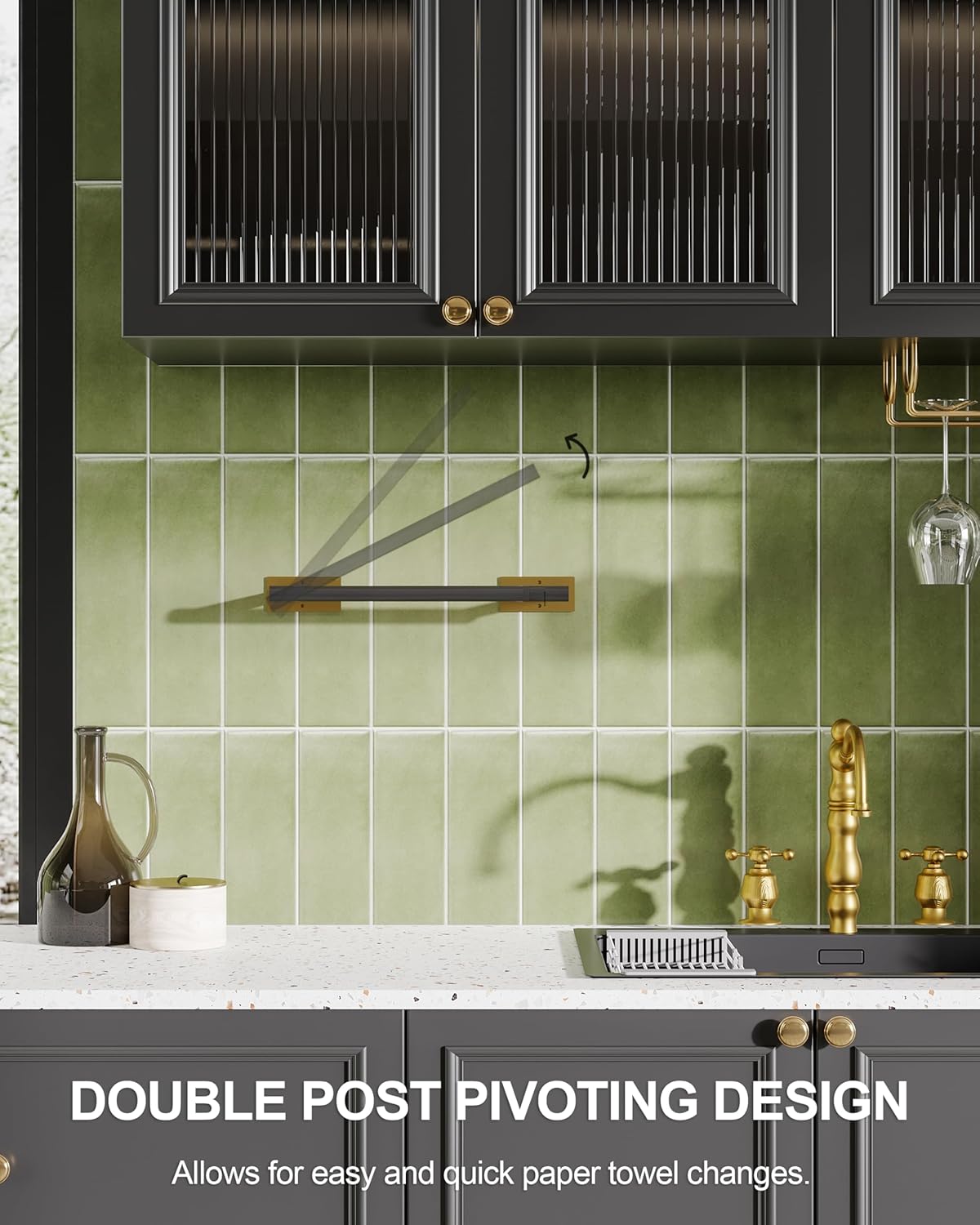 - [Double-Post Pivoting] The double-post pivoting design makes wall mount paper towel holder simple to replace the paper towels. The paper towel holder wall mount's revolving buckle successfully keeps the kitchen towel from coming off, and the symmetrical design adds aesthetic value to your kitchen