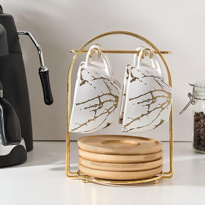 - 【SAVE COUNTER SPACE】 Each Cup: Dia:3.74", H:2.56". Capacity(full): 8oz /237 ml. Each saucer: Dia:4.92 ", H:0.5 ".The combination of the coffee cup set and the iron frame can prevent the cups and saucers from being randomly placed.They are the best collocation in your life.