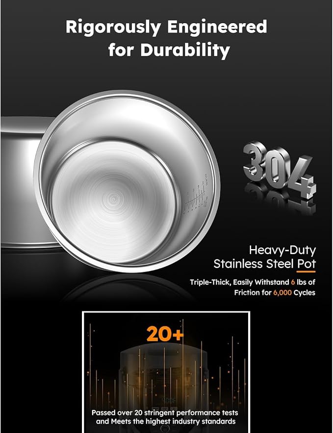 - 3-THICKER INNER POT: The pressure cooker inner pot crafted from heavy-duty 18/10 stainless steel, triple-thick, non-coated, easily withstand 6 lbs of friction for 6,000 cycles. Bone-Friendly and Wear-Resistant.