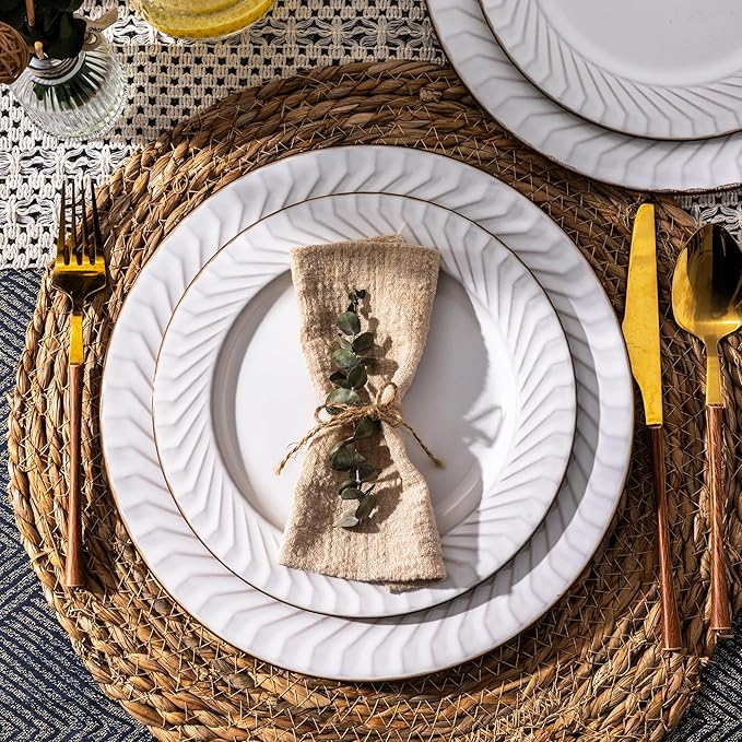 - UNIQUE MODERN DESIGN: Our 12-piece ceramic dinnerware set features a modern and elegant embossment design, allowing your dinner plate and bowl to be the star of the table. The glaze is white color with light embossment, and darkened rims, which look ultra classy and beautiful. This white dinnerware set is durable enough for everyday use for the family, yet sophisticated enough for that important dinner party or special event. Perfect for wedding and housewarming gifts