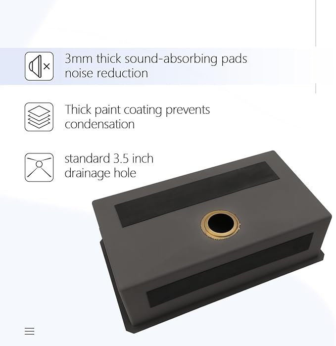 - Patented Design - X-shaped diversion water design, with a gently sloped bottom that prevents standing water inside the bowl fast drainage, no blockage. Heavy-duty 3-mm thick rubber pads minimize noise and reduce condensation, well protect sink cabinet from condensation damage and provide you a quiet kitchen environment