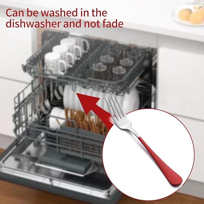 Red Dinner Fork, 18/0 Red handle Stainless Steel Satin Finish 8.1-inch Silverware Flatware Fork Set, Set of 24, Dishwasher Safe