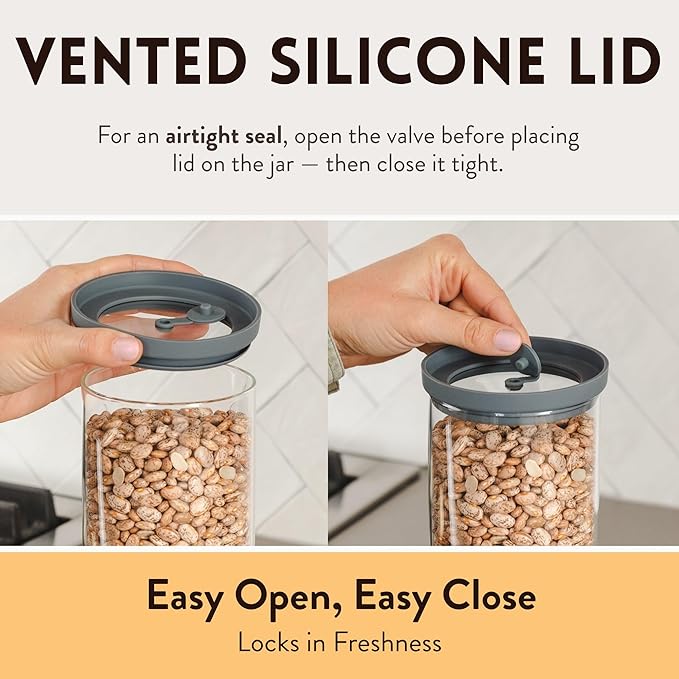 - Exclusive Vent Design Locks in Freshness: A proprietary venting design on the silicone cover locks in freshness; Simply “pop” open the valve before placing the lids on your canisters and close valve to store pasta, snacks and flour without moisture