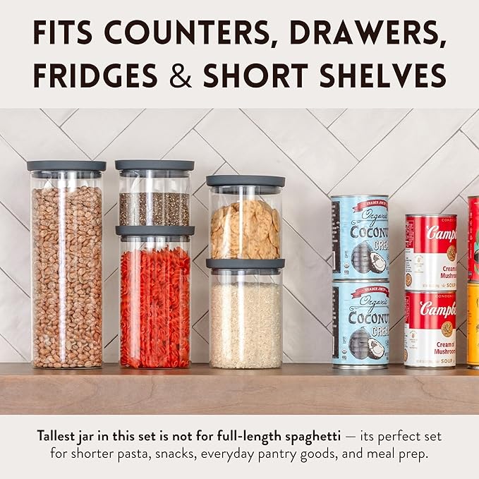 - Versatile Set Includes Pasta Portion Tool: This set includes five glass jars of assorted sizes that neatly stack together and a stainless steel spaghetti portion tool for faster meal prep