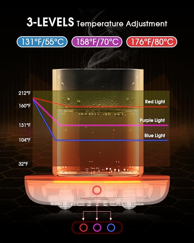 - ☕【Keep Coffee Warm】Our coffee warmer can keep your coffee, milk, tea and other beverage at a perfect drinking temperature, keeping coffee up to 131° F/158° F/176° F by touching the “Power Button”. Keep your drink warm from first to last sip. It won't heat your drink very hot like a microwave or a kettle.