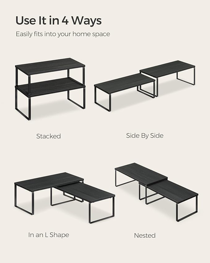 SONGMICS Cabinet Organizer Shelf, Set of 4 Kitchen Counter Shelves, Kitchen Storage, Spice Rack, Stackable, Expandable, Metal and Engineered Wood, Ink Black and Ebony Black UKCS028B01