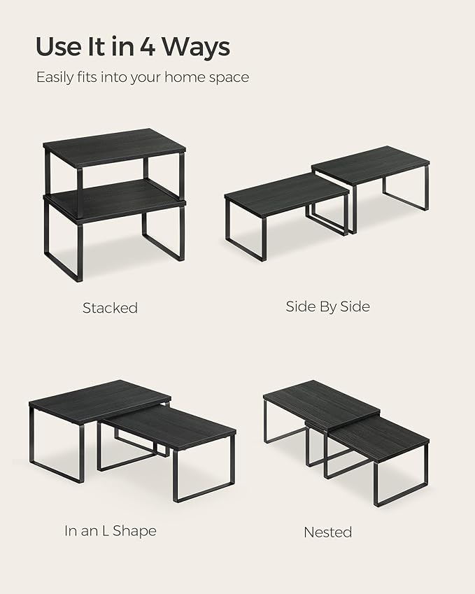 SONGMICS Cabinet Organizer Shelf, Set of 4 Kitchen Counter Shelves, Kitchen Storage, Spice Rack, Stackable, Expandable, Metal and Engineered Wood, Ink Black and Ebony Black UKCS027B01