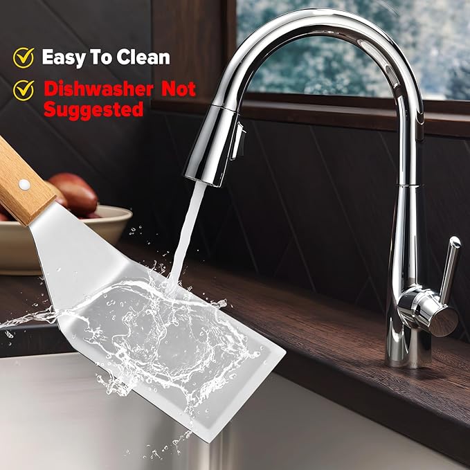- Premium Material: Our kitchen metal spatula is made of high-quality stainless steel,heat resistant, ergonomic and durable.The wooden handle is natural,no rustic and healthy,making it safe to use in the kitchen or outdoors