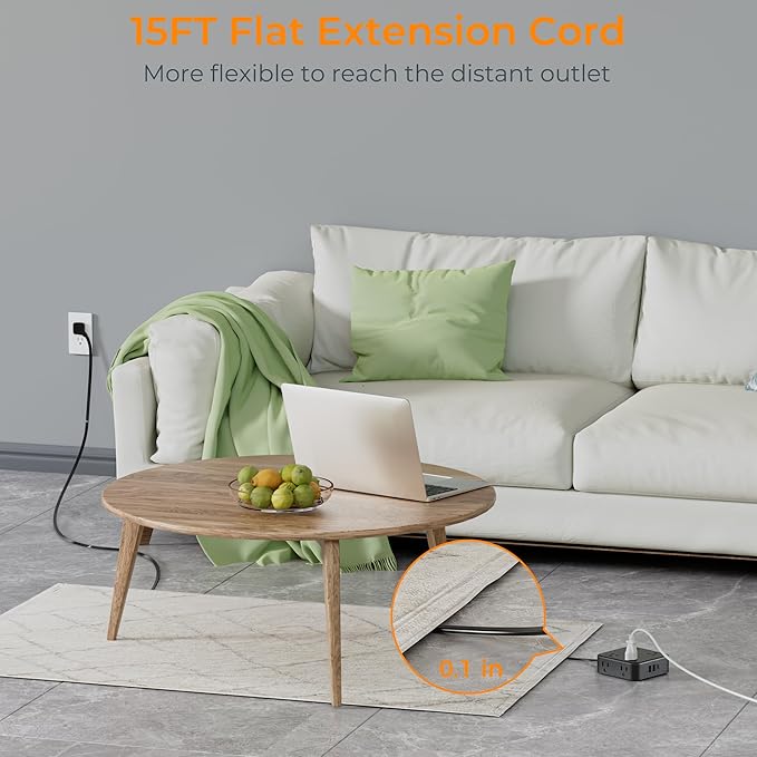 - Extension Cord 15 Ft: Extra long 15ft cord can more flexibility to reach distant outlets and hard to reach places; 0.12in flat cord can easily run along the wall, floor or under carpet without causing a bulge, protect your family from tripping, makes sweeping and mopping easier