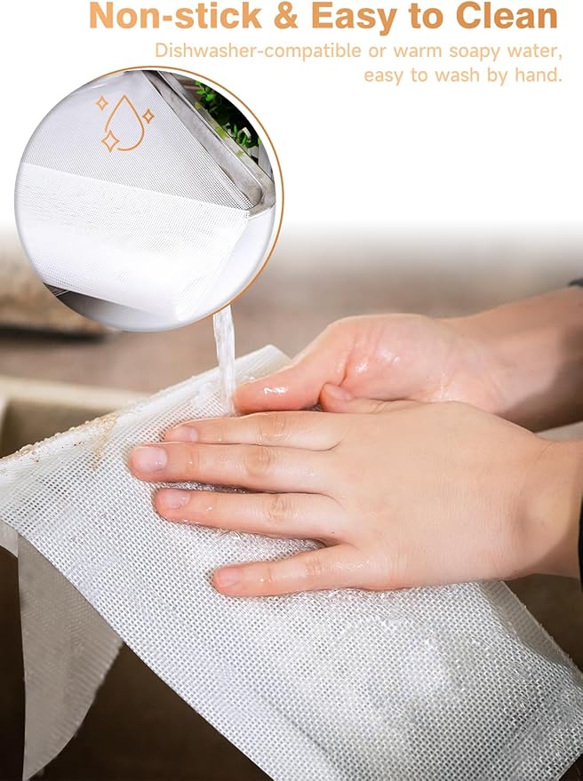 - Easy to Clean: The non-stick properties of the dehydrating mat can quickly separate food debris, help keep our dehydrated food from sticking to the rack, very easy to clean. It can be washed in the dishwasher or warm soapy water, hand washing is also easy, randomly rubbing is not easy to deform, soft, and tough. According to the frequency of use every 3-5 days warm water soaking and cleaning, ensure the use of a silicone steamer mat.